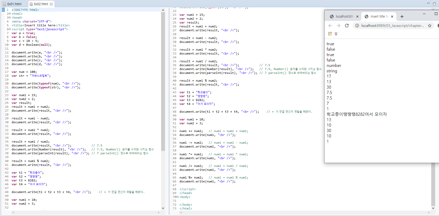 - 자바스크립트의 비교 연산자 중 ==와 ===는 자바와 다르다.