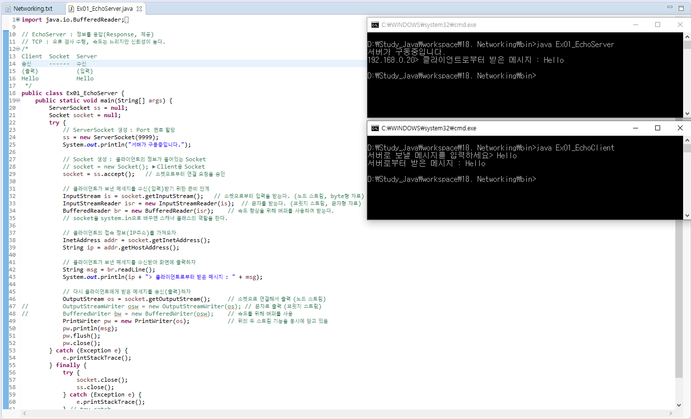 - Socket 간의 통신은 JAVA의 IO를 이용해서 통신 (IO의 연장선)