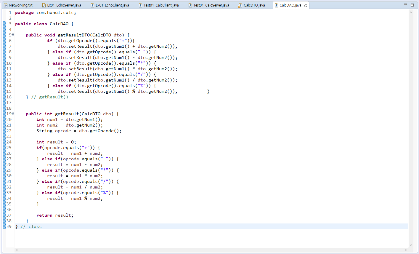 ⑥ (Server) 수신받은 DTO 객체의 멤버 변수를 이용하여 사칙 연산을 수행하고 DTO 객체에 담는 메서드 getResultDTO()를 호출