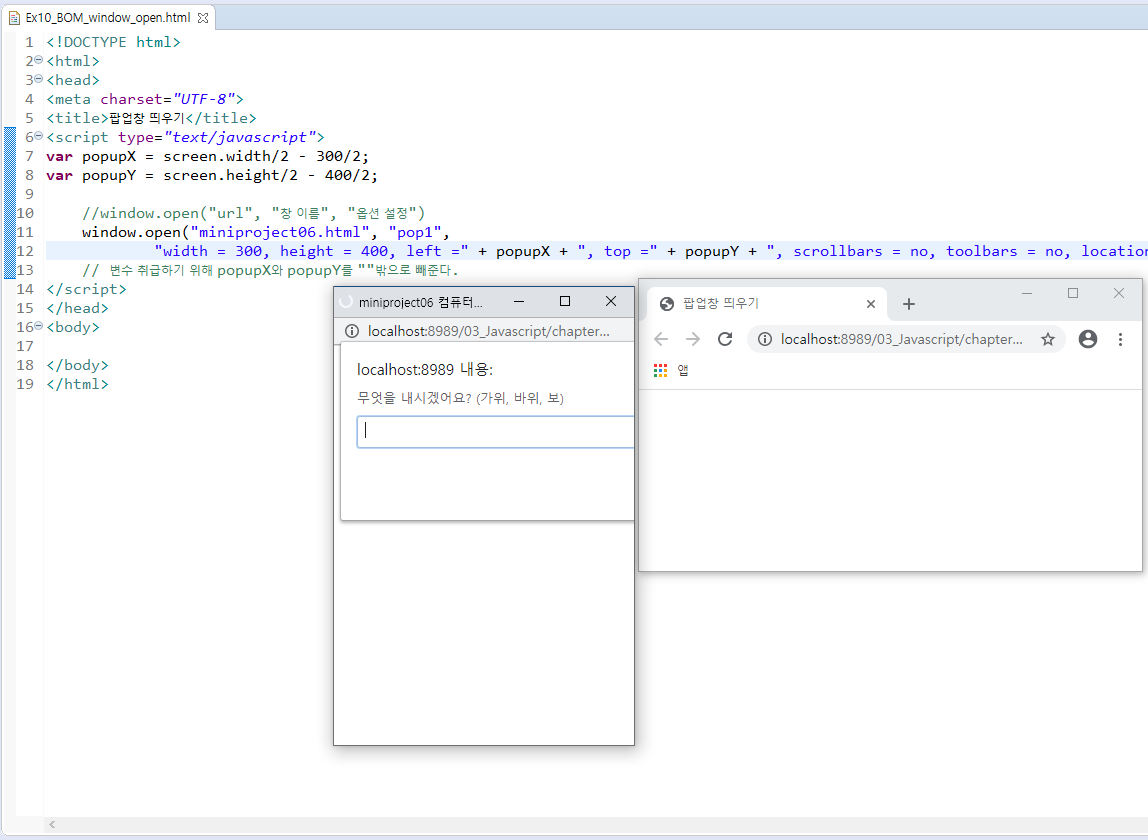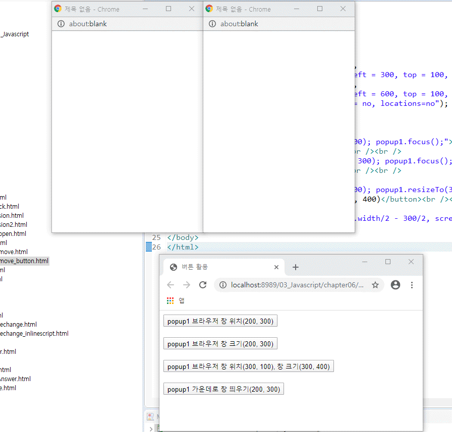 - 팝업창.focus() 하면 연동된 함수가 작동할 때 해당 창이 맨 위로 올라온다.