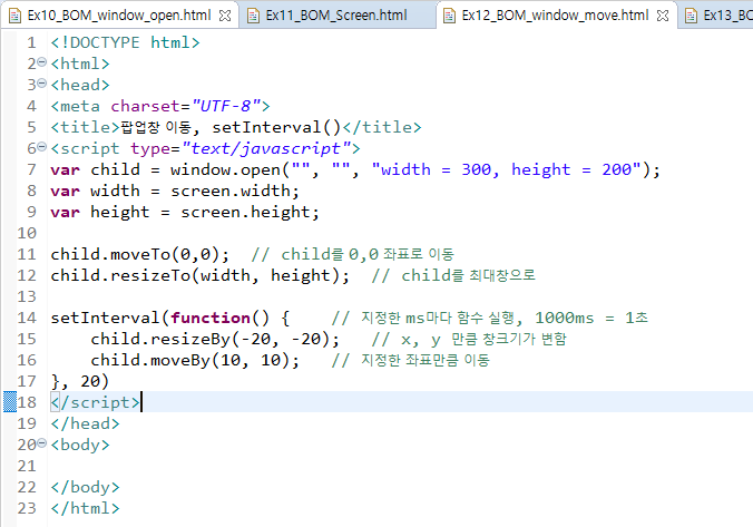 7. BOM, window.open, screen 객체, resizetTo, moveTo, setInterval, clearInterval, setTimeout, clearTimeout, history