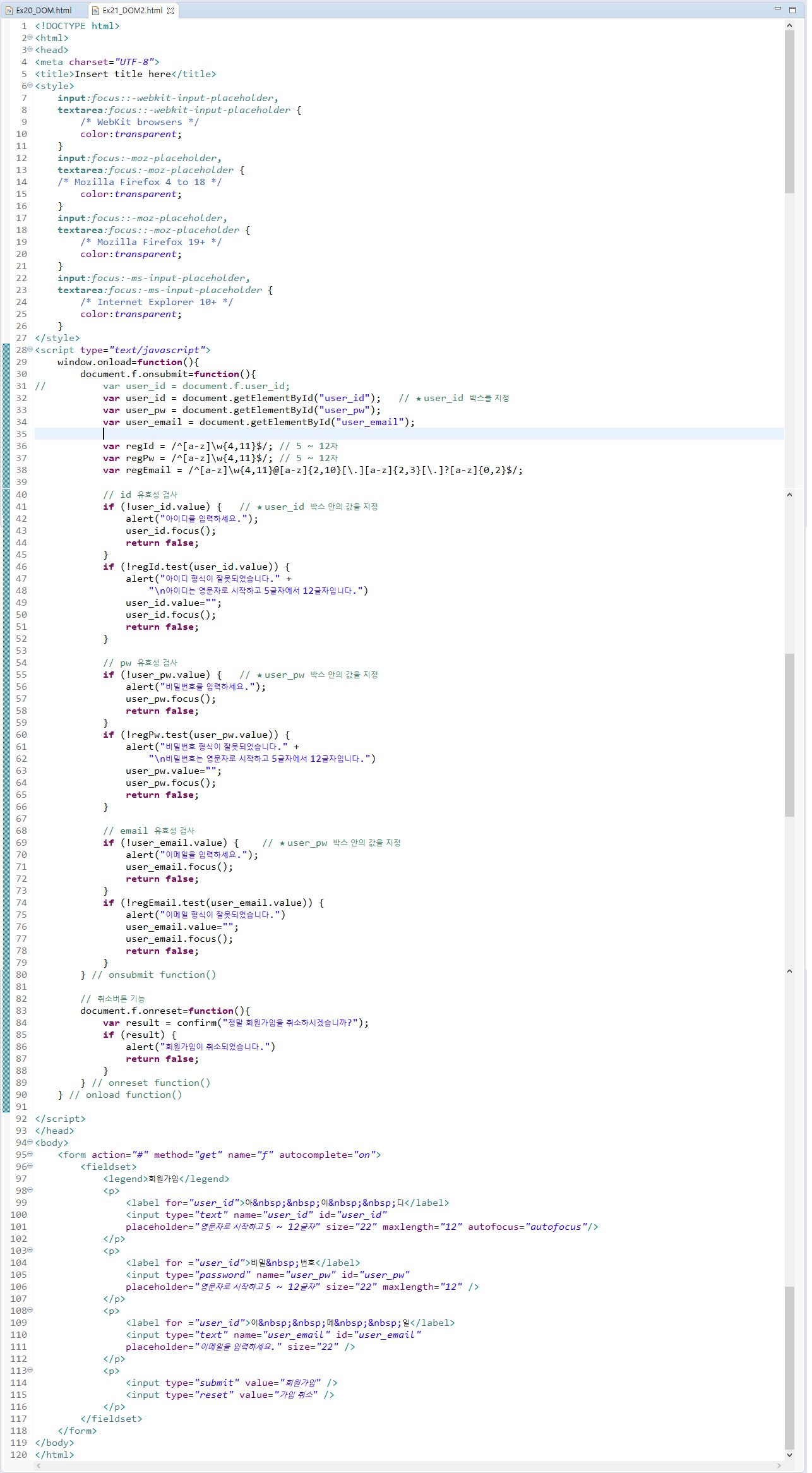 ② 아이디, 비밀번호, 이메일을 원하는 양식에 맞추기 위해 정규 표현식을 작성한다.