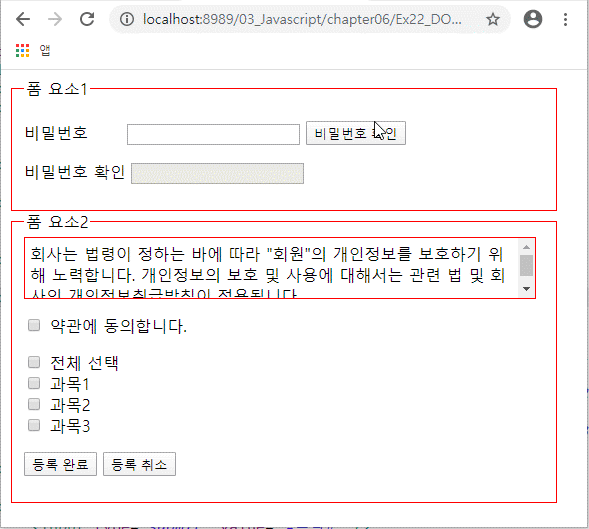 ④ 전체 선택 박스를 체크했을 때 과목 1, 2, 3도 같이 체크되는 함수를 작성한다.