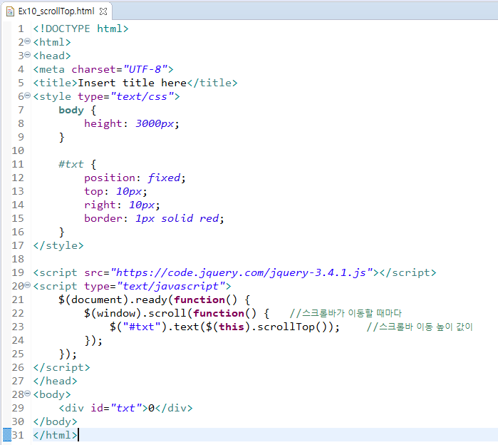 - scrollTop() : 스크롤바의 높이 값을 반환하는 메서드