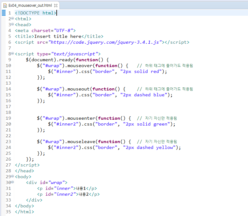 - mouseout() : 선택한 요소의 영역에서 마우스가 벗어났을 때 작동하는 메서드, 자식 요소위에서 마우스가 벗어났을 때도 작동