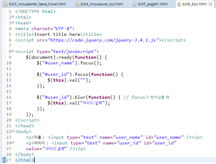 - blur() : 선택한 요소의 포커스가 다른 요소로 이동되었을 때 이벤트를 발생시키거나, 선택한 요소에 강제로 포커스가 사라지게 함