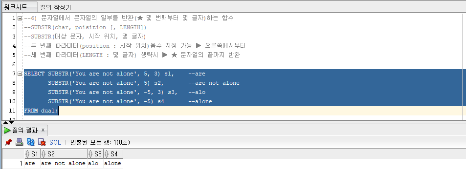 - 추출할 글자 수 항목은 생략 가능하고 생략하면 문자열의 끝까지 반환된다.