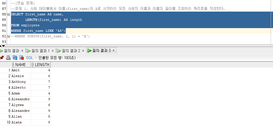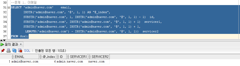 - SUBSTR(대상 문자열, 시작 위치, 반환할 글자 수)