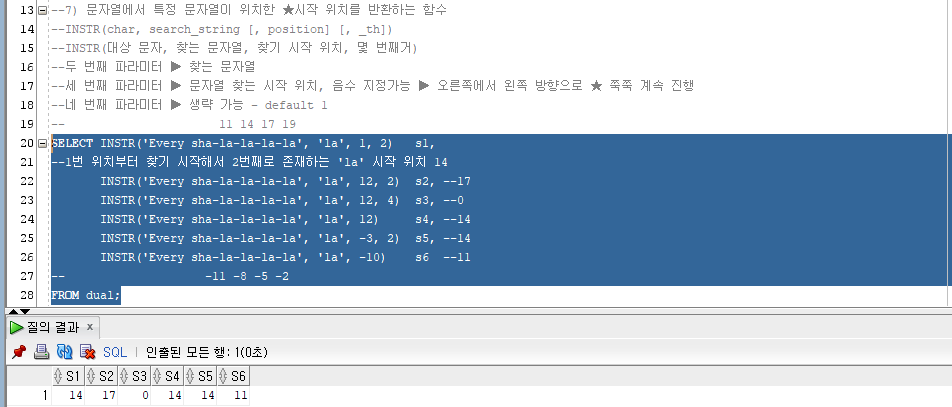 - INSTR(대상 문자열, 찾는 문자열, 시작 위치, 순번)