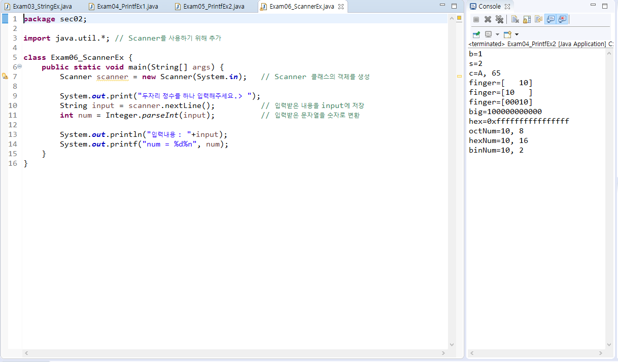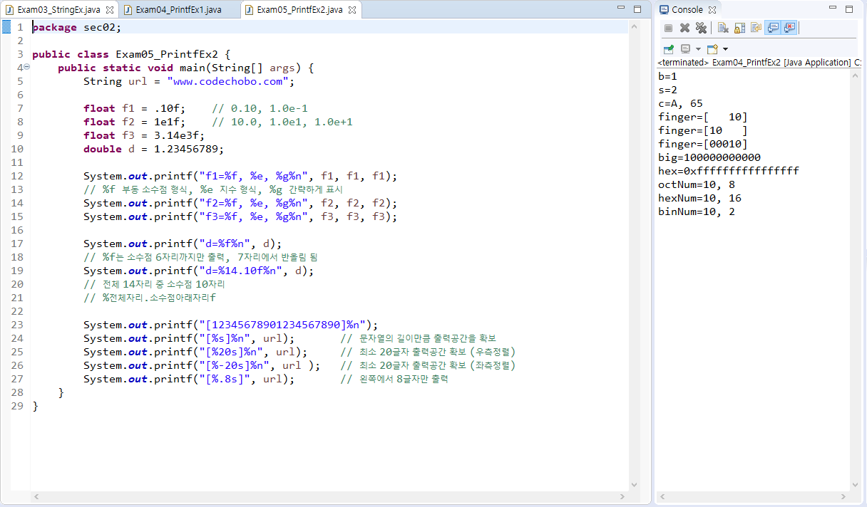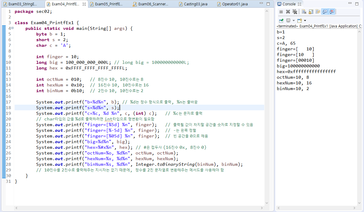 | %x, %X | 16진 (hexa-decimal) 정수의 형식으로 출력 |