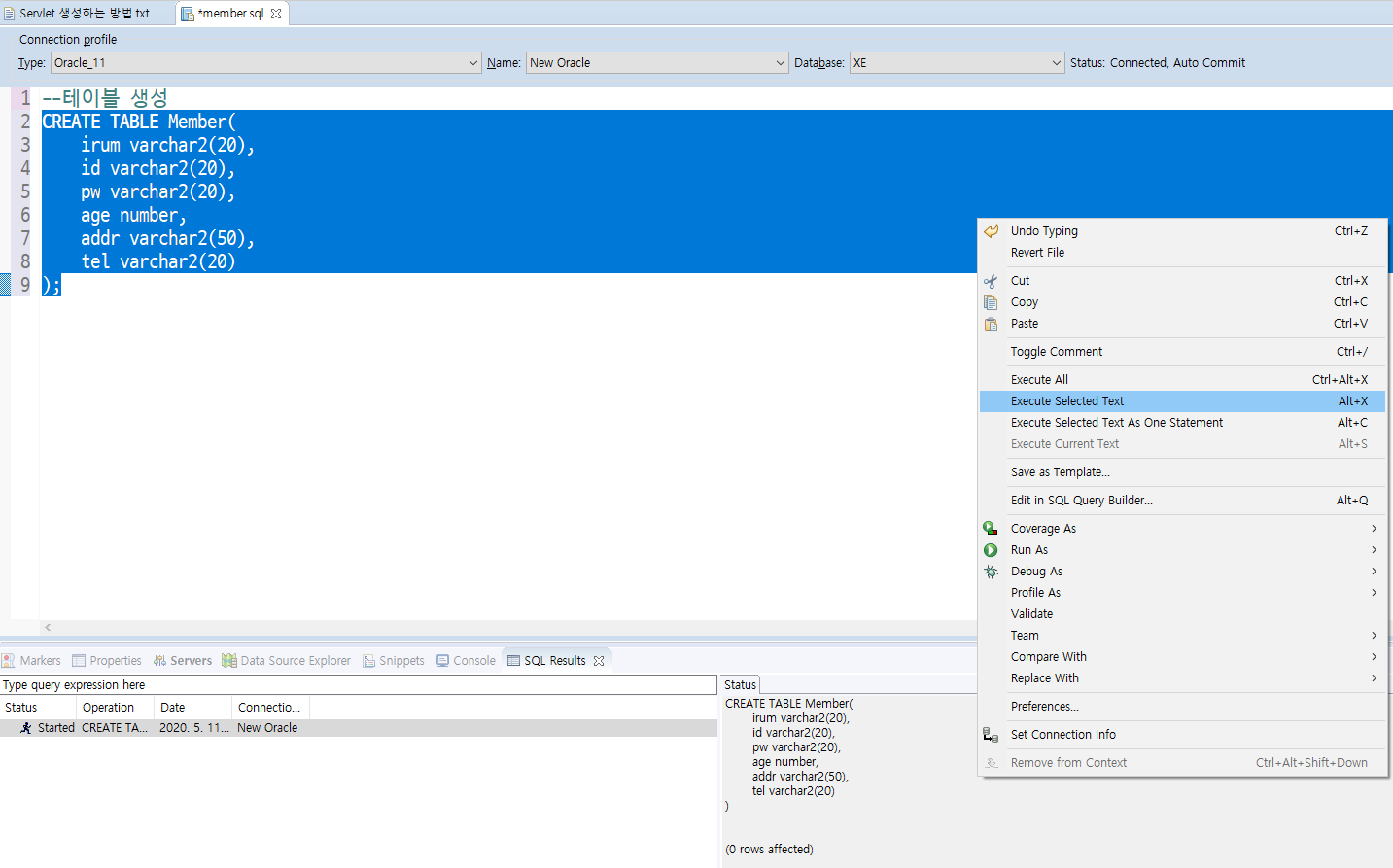 - 블록 지정 후 우클릭 - Execute Selected Text(Alt + X)로 SQL문을 실행할 수 있다.