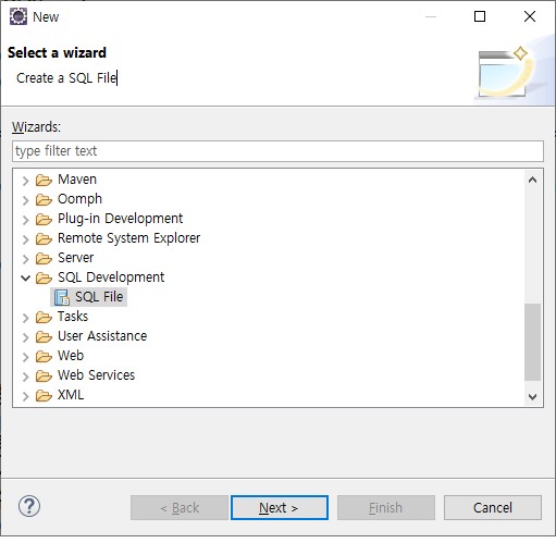 - 원하는 경로 우클릭 - New - Other... - SQL Development - SQL File