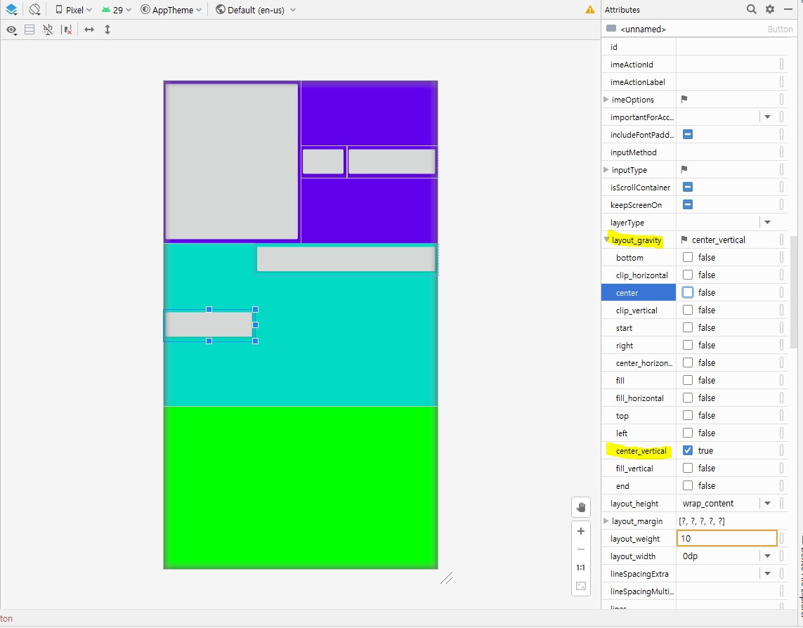 - 속성 탭의 layout_gravity 설정으로 레이아웃 내부의 정렬 위치를 설정할 수 있다.