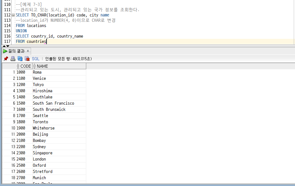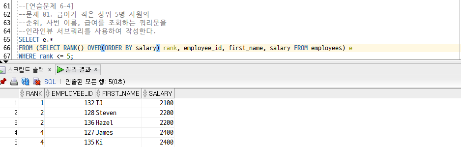 [Oracle] 15. ROWNUM/ RANK() OVER(), DENSE_RANK() OVER() /연습문제 6 - 4/SET 연산자 : UNION, INTERSECT, MINUS