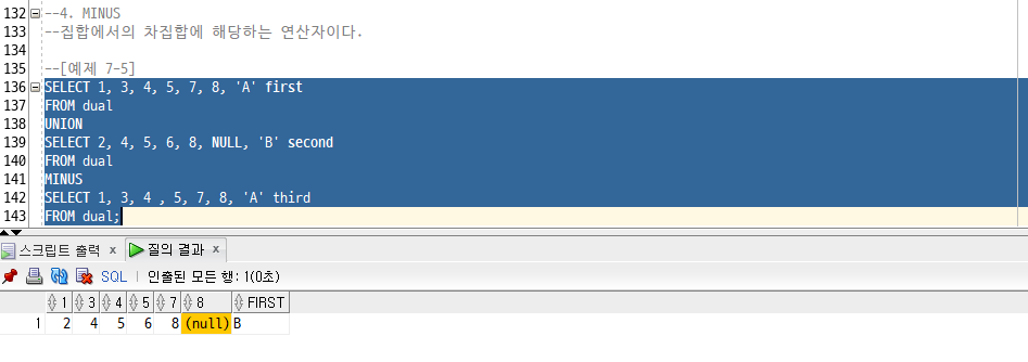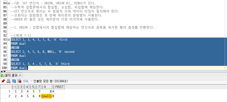 - SET 연산자 : UNION, INTERSECT, MINUS -