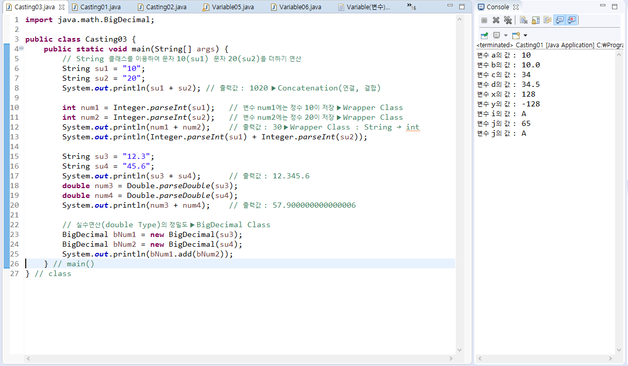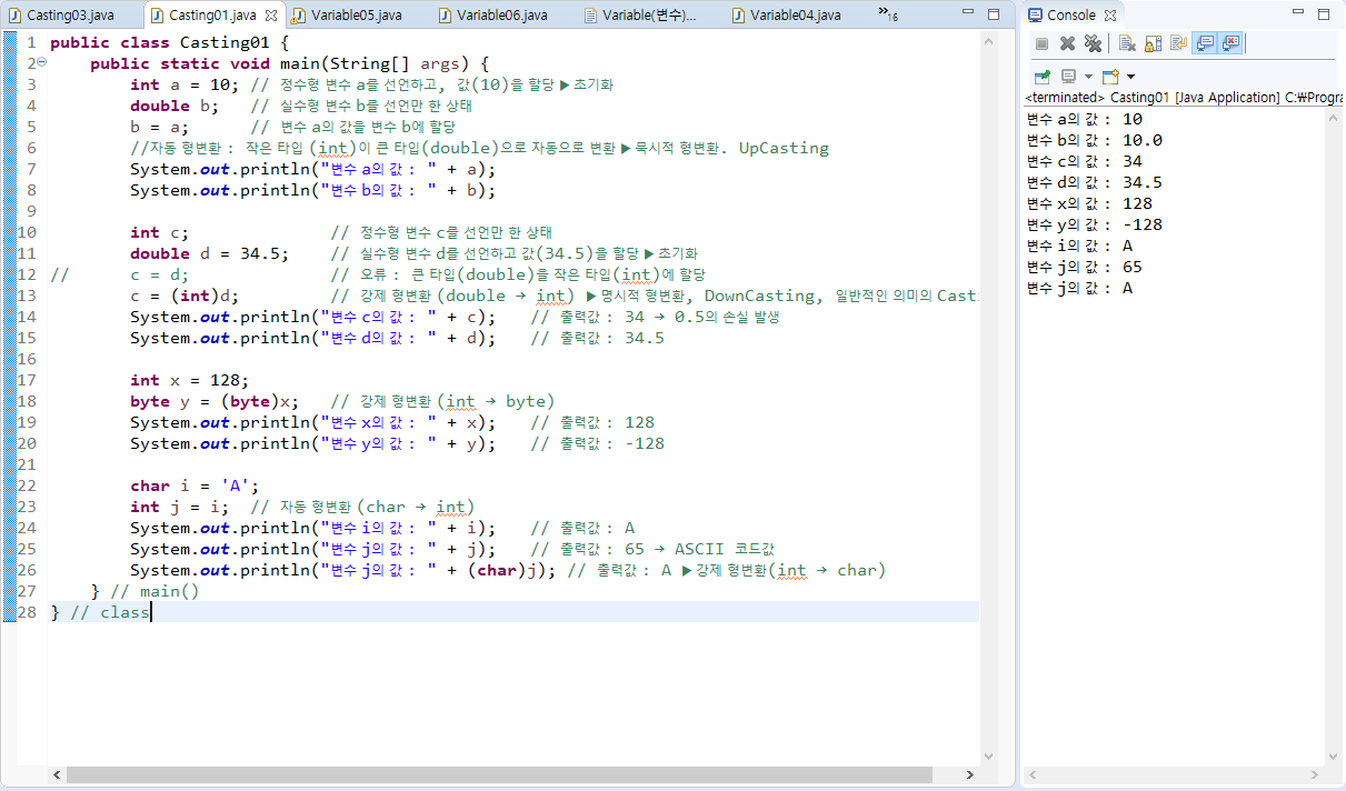 - 강제 형변환은 일반적으로 큰 타입을 작은 타입에 할당할 때 사용하며 명시적 형 변환이라고도 한다.