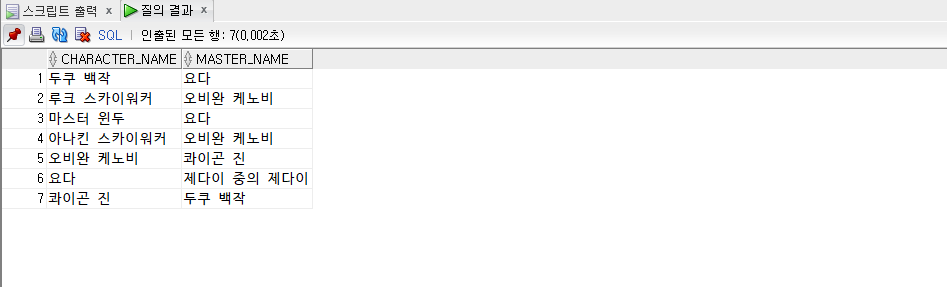 SELECT c.character_name, NVL(m.character_name, '제다이 중의 제다이') master_name