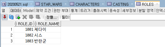 --두 칼럼은 각각 STAR_WARS와 CHARACTERS 테이블의 기본키를 참조하고 있다.