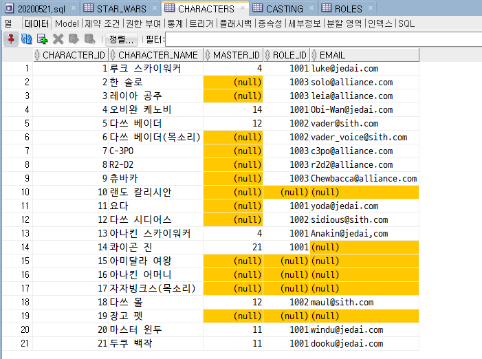 --2. CHARACTERS 테이블에는 스타워즈에 등장하는 각 배역들의 정보가 들어 있다.