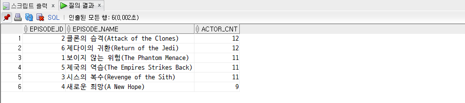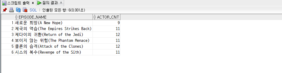 --에피소드 이름과 출연 배우 수를 개봉년도 순으로 조회하는 쿼리문을 작성한다.