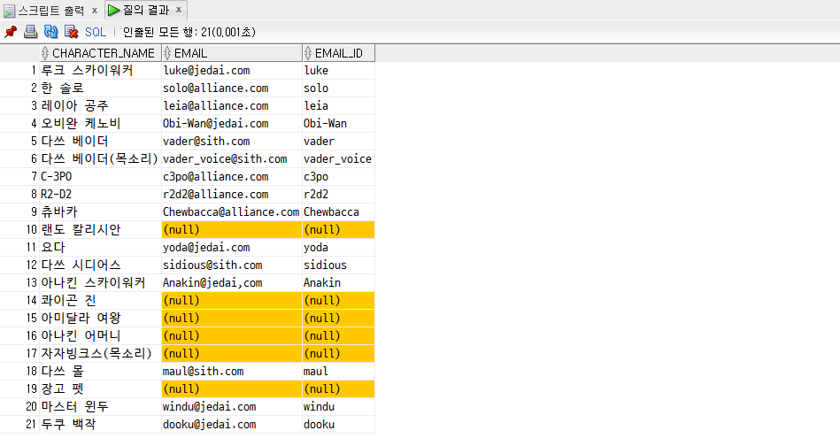 --6. CHARACTERS 테이블에서 배역 이름, 이메일, 이메일 아이디를 조회하는 쿼리문을 작성한다.