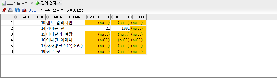 -- character_id : 등장인물 아이디, 숫자 타입(5), 기본키