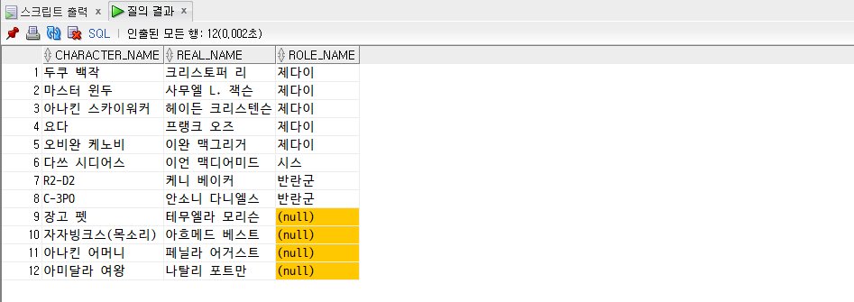 --7. 역할이 제다이에 해당하는 배역들의 배역 이름과 그의 마스터 이름을 조회하여 다음의 결과가 나오도록 작성한 쿼리문이다.