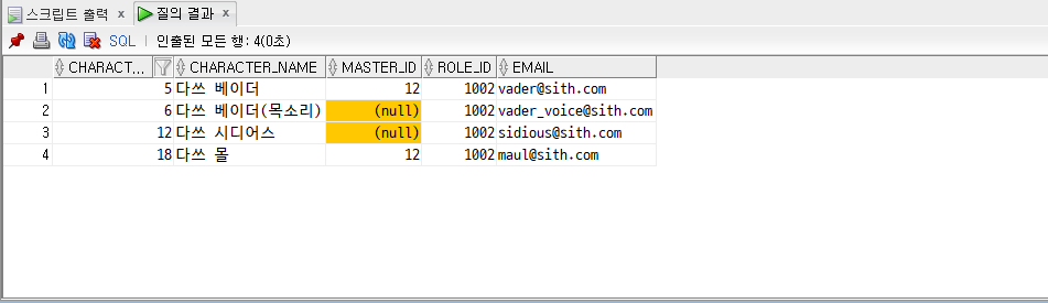 --이들 중 그 역할이 시스에 해당하는 등장인물을 조회하는 쿼리문을 작성한다.