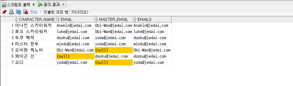 --없으면 마스터의 이메일을 사용하는 EMAILS라는 칼럼까지 추가하여 조회하는 쿼리문을 작성한다.