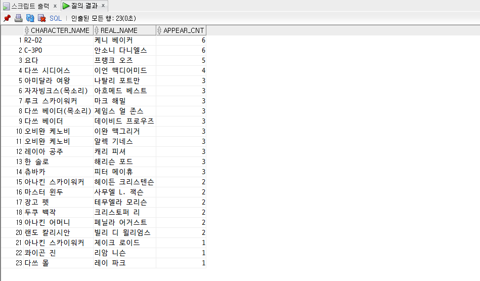--출연 횟수가 많은 배역 이름, 실제 이름 순으로 조회하는 쿼리문을 작성한다.