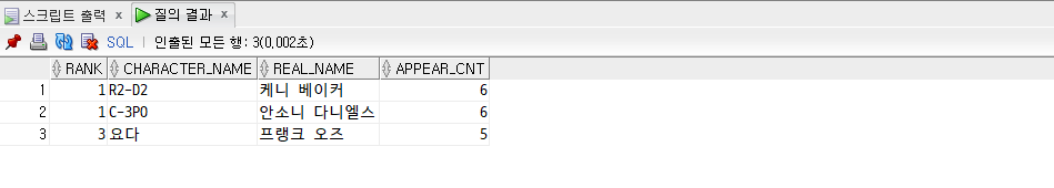FROM (SELECT RANK() OVER(ORDER BY COUNT(*) DESC) rank, character_name, real_name, COUNT(*) appear_cnt