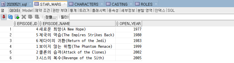 --1. 테이블명 : STAR_WARS(영화 정보)