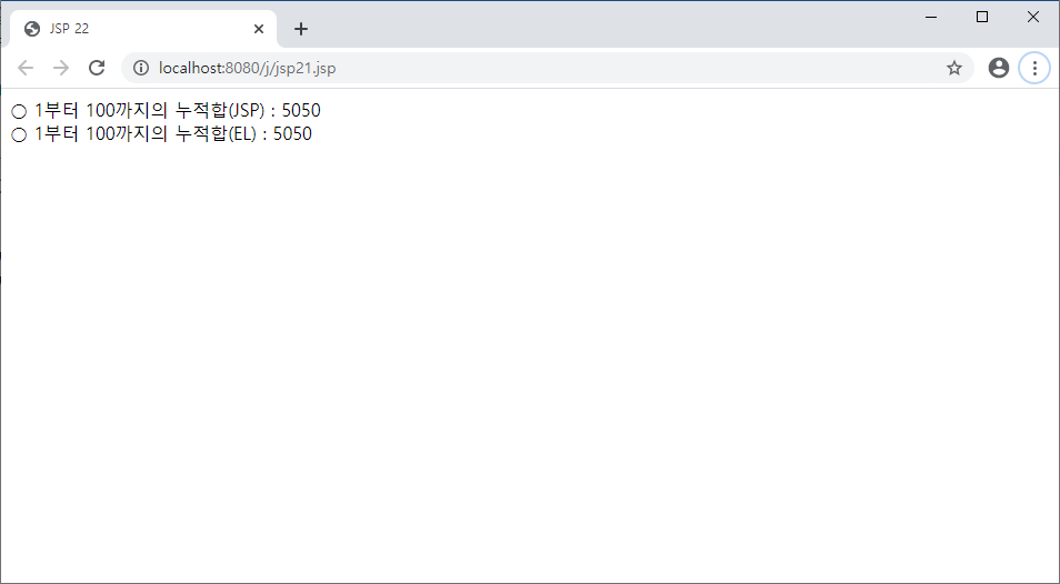 ○ 1부터 100까지의 누적합(JSP) : <%=sum %><br />
