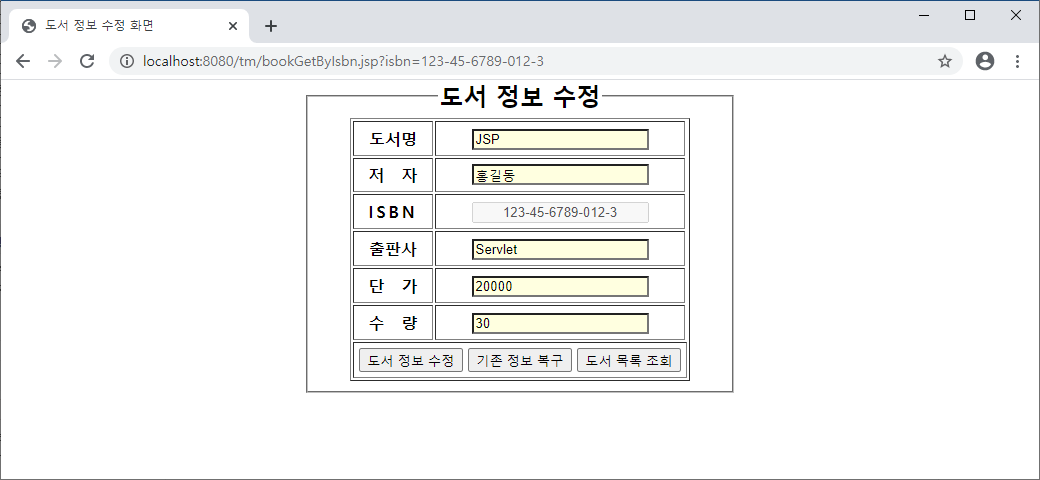 도서 정보 수정(jsp08, jsp09) : bookSearchAll.jsp → bookGetByIsbn.jsp → BookDAO.java → bookGetByIsbn.jsp → bookUpdate.jsp → BookDAO.java → bookUpdate.jsp → bookSearchAll.jsp