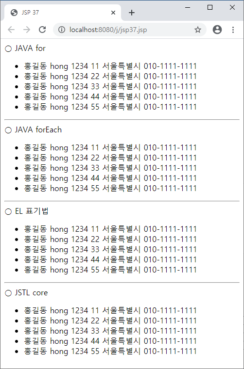 list.add(new MemberDTO("홍길동", "hong", "1234", 55, "서울특별시", "010-1111-1111"));
