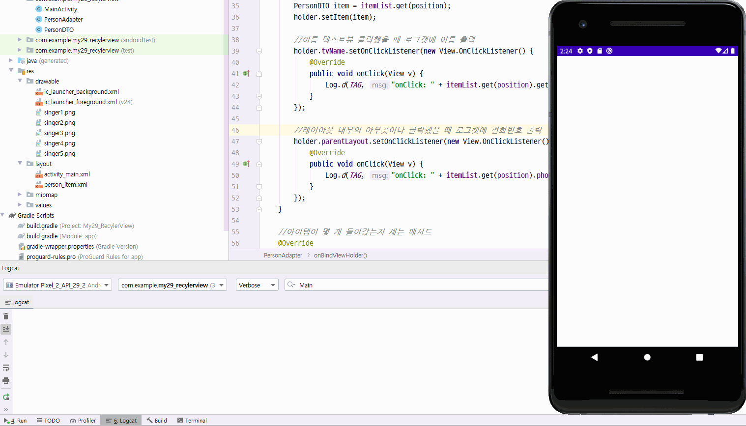 - 리사이클러 뷰(Recycler View) ① : 리사이클러 뷰, 어댑터 작성, 클릭 이벤트 추가 -