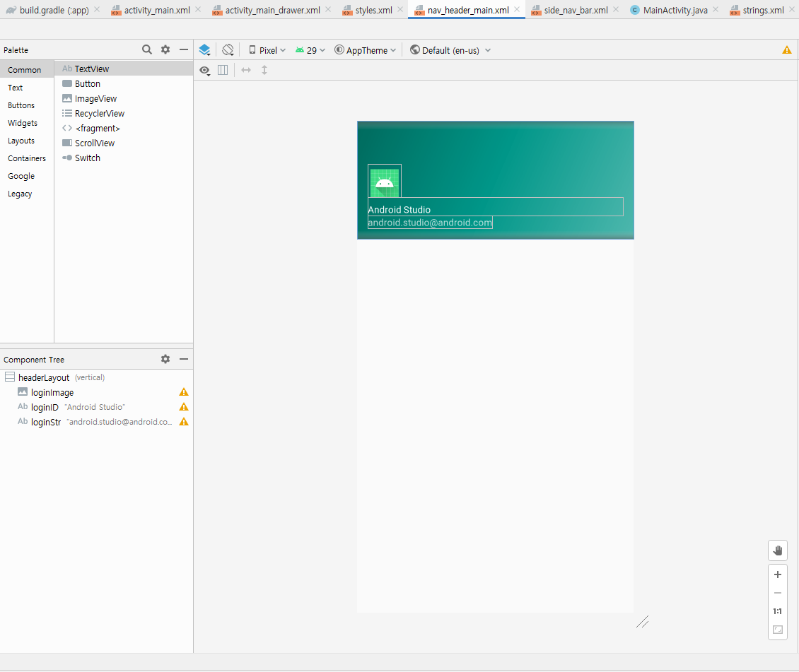 <!--헤더뷰와 아이템을 찾아서 사용한다-->