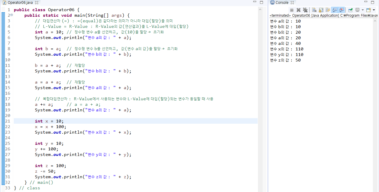- 복합 대입 연산자는 오른쪽 피연산자와 왼쪽 피연산자의 변수가 동일할 때 사용한다.