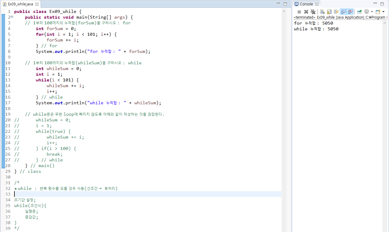 - 조건문이 true면 계속 반복하기 때문에 무한 loop에 빠지기 쉽다.