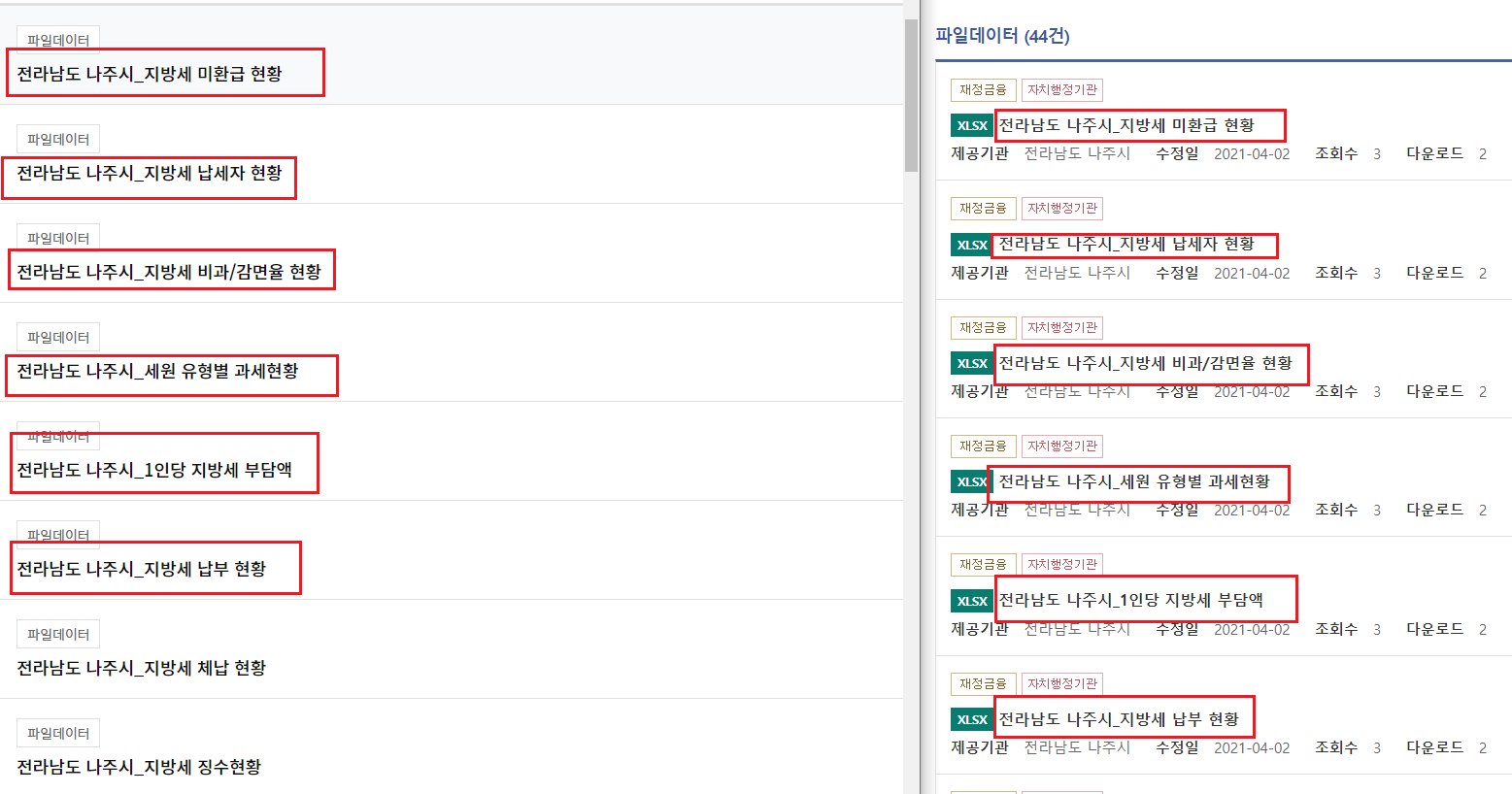 공공데이터 포털에서 나주시가 제공하는 API들을 파싱 하여 목록으로 가져온 페이지입니다.