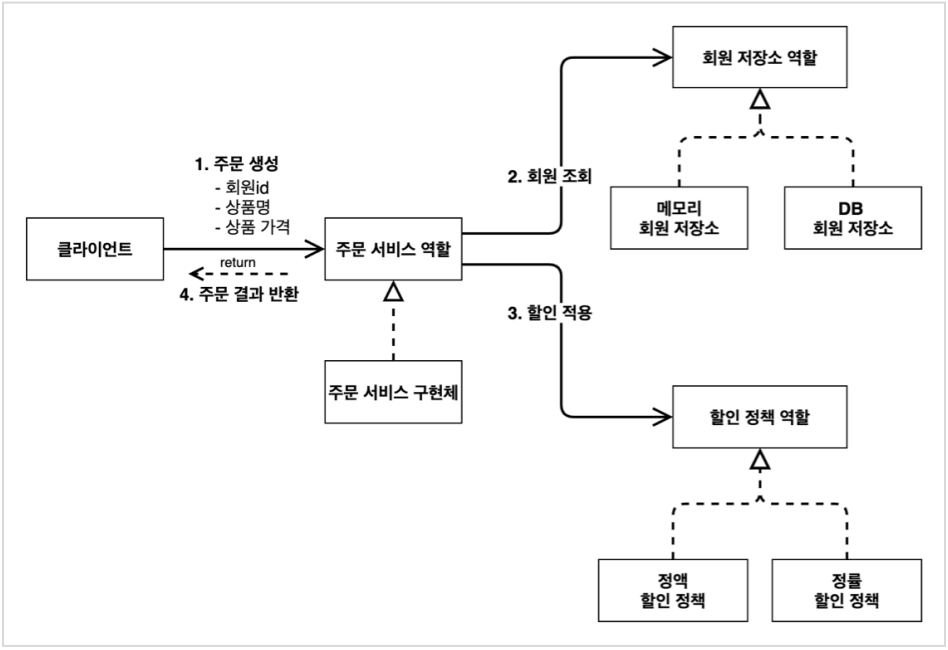 - 회원을 메모리에서 조회하고, 정액 할인 정책(고정 금액)을 지원해도 주문 서비스를 변경하지 않아도 된다.