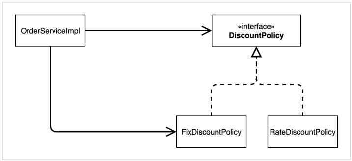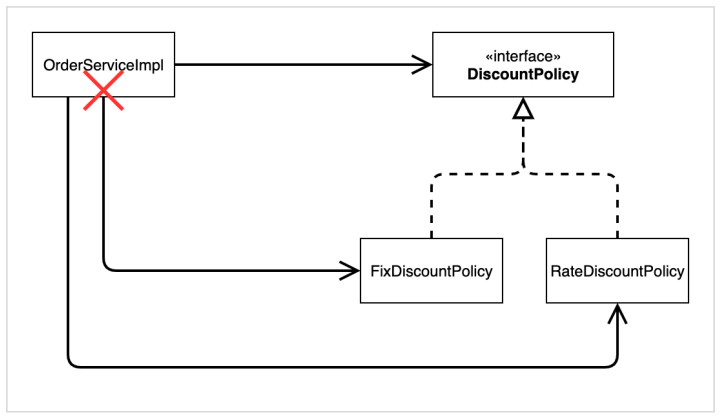 - DIP : 주문서비스 클라이언트(OrderServiceImpl)는 DiscountPolicy 인터페이스에 의존하면서 DIP를 지킨 것 같지만