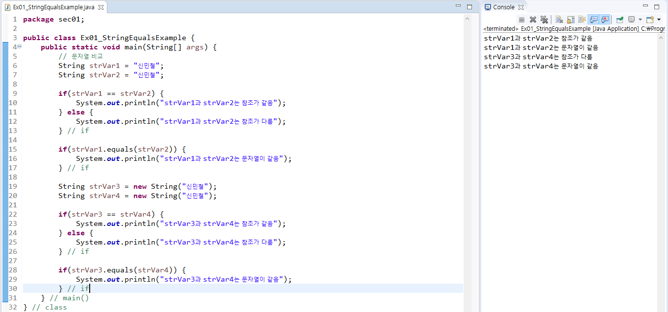 - 동일한 번지 값을 갖고 있다는 것은 동일한 객체를 참고한다는 의미이며 == 연산의 결과는 true가 된다.