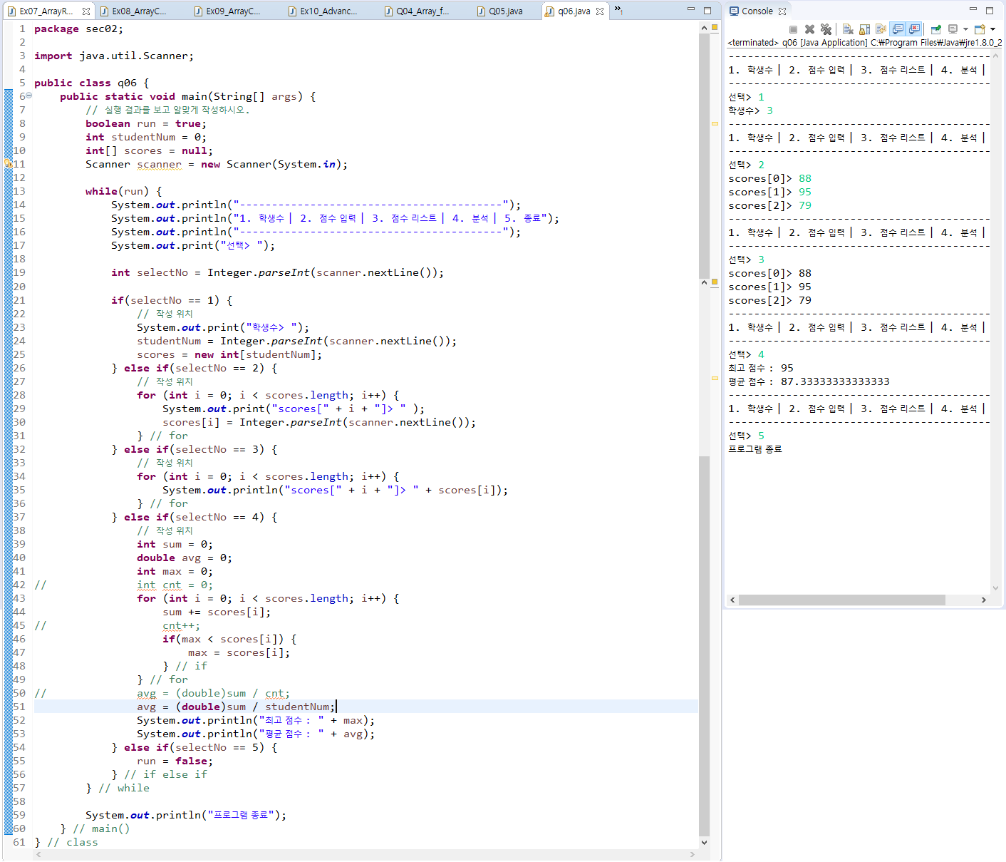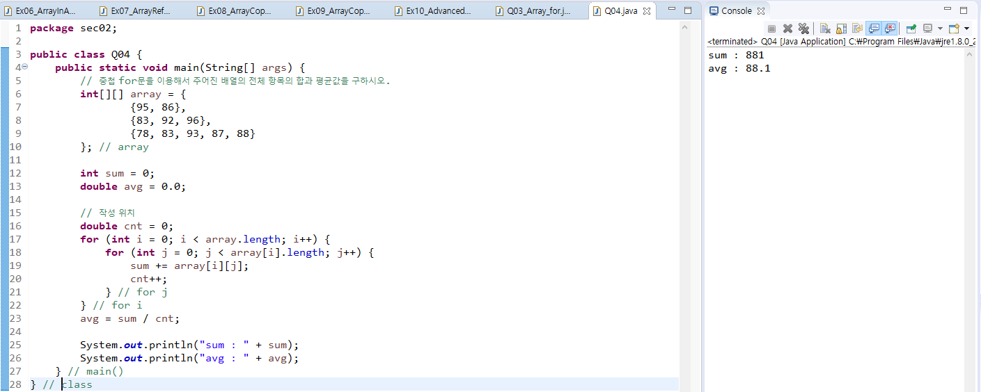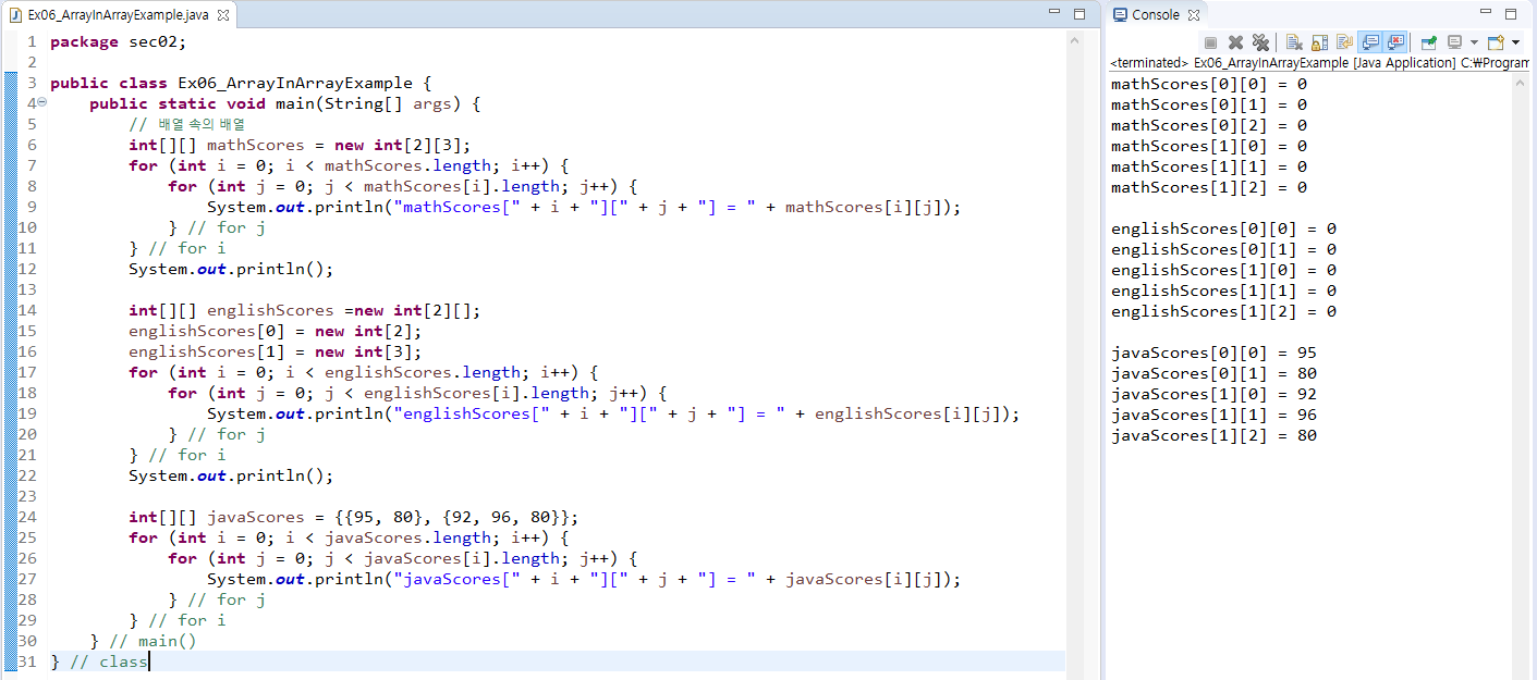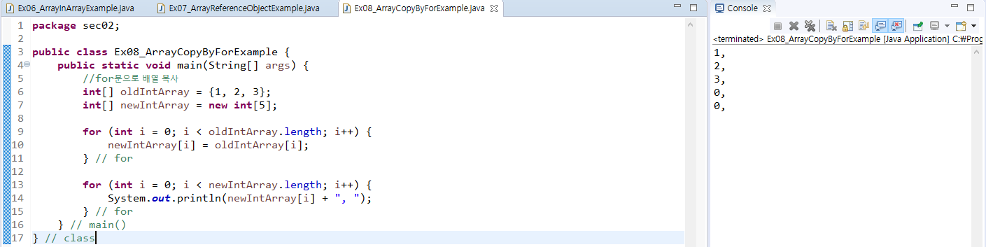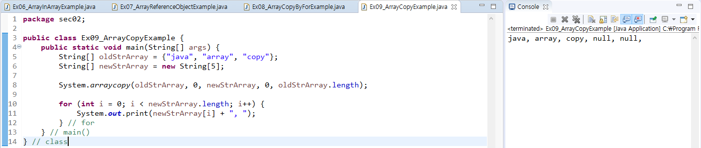 - 배열 간의 항목 값 복사는 for문을 사용하거나 System.arraycopy() 메소드를 사용한다.
