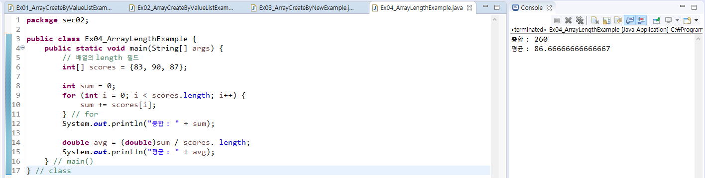 - 코드에서 배열의 길이를 얻으려면 배열 객체의 length 필드를 읽는다.