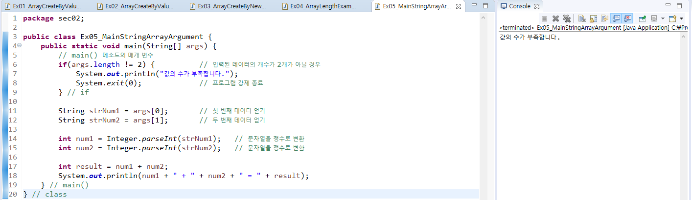 - 실행할 때 매개값을 주지 않으면 길이 0인 String 배열이 매개값으로 전달되고 args.length는 0이 된다.