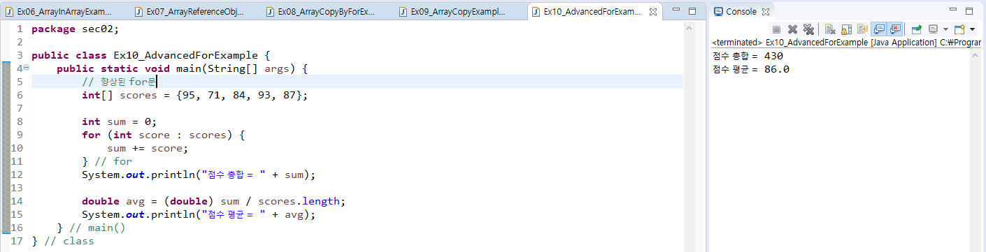 - 자바는 배열이나 컬렉션을 좀 더 쉽게하기 위해 향상된 for문을 제공한다.