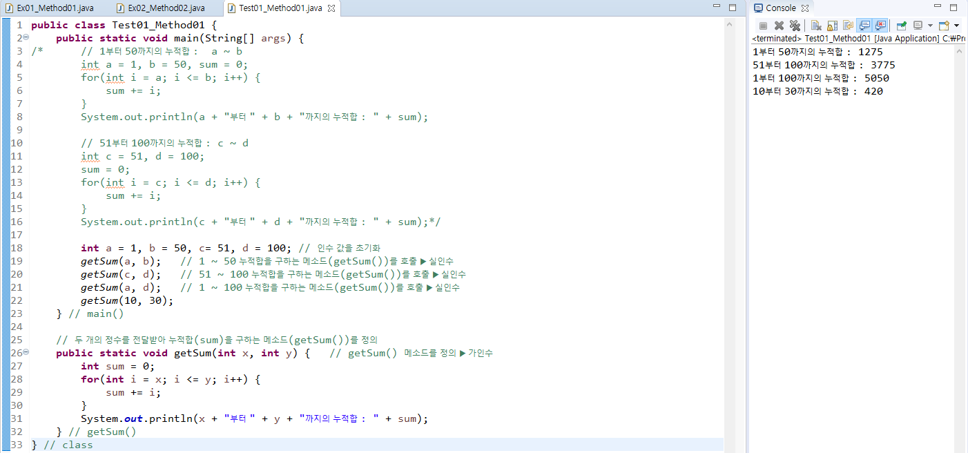 - 클래스 안에 메소드를 구현하고 한 클래스 안에는 여러 메소드가 들어간다.