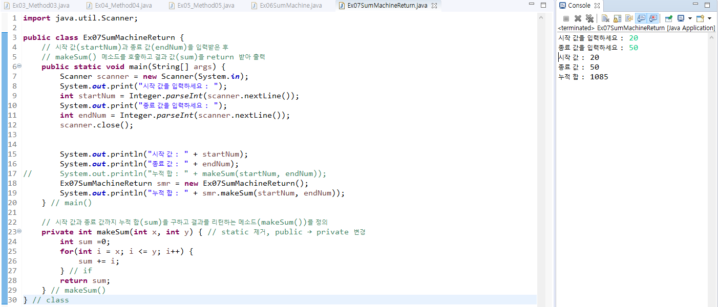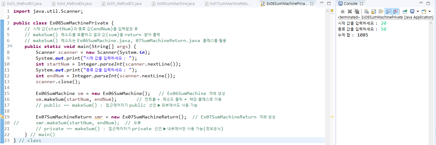 - public을 private으로 바꾸면 다른 클래스에서는 호출이 안된다.