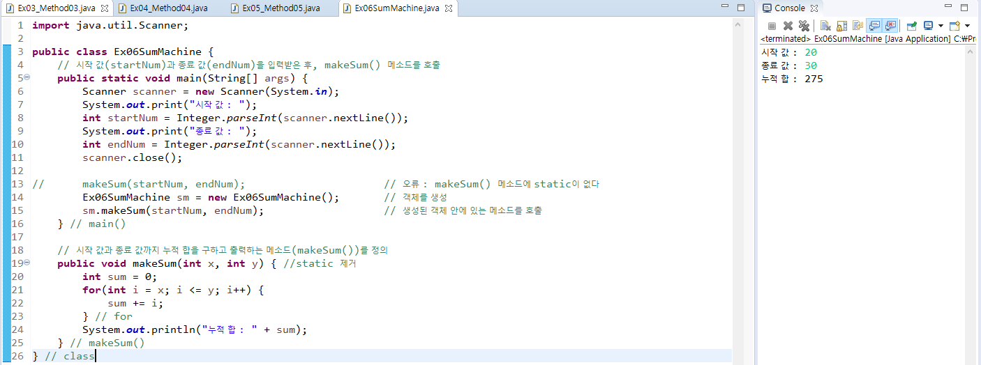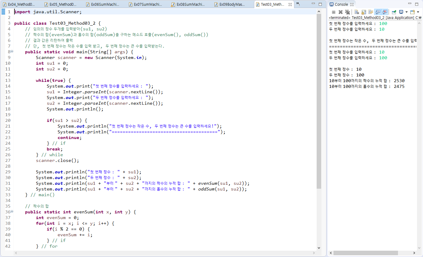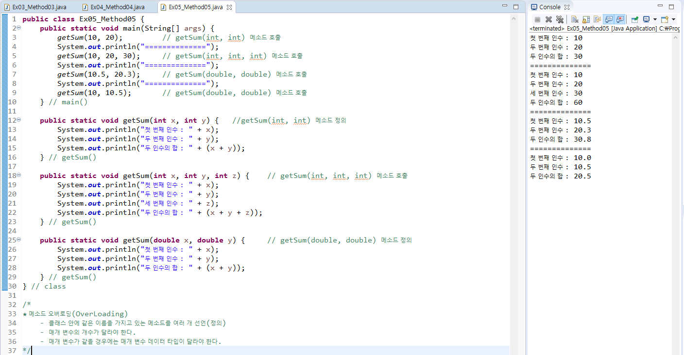 - 같은 이름을 가진 메소드는 매개 변수의 개수가 다르거나 매개 변수 데이터타입이 달라야 한다.